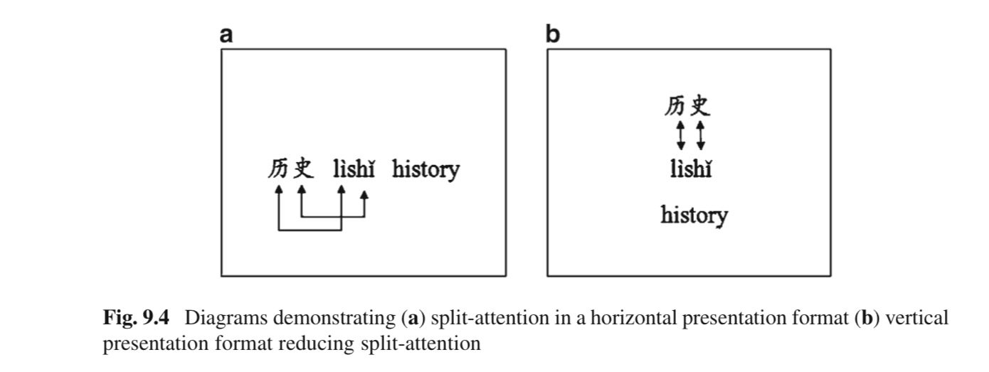 Sweller, Ayres, dan Kalyuga menawarkan beberapa upaya untuk mengurangi beban kognitif. Salah satunya adalah mengurangi the split-attention effect. The split-attention effect adalah fenomena ketika siswa kesulitan untuk membagi perhatian antara dua atau lebih sumber informasi yang terpisah. Efek ini terjadi ketika siswa dihadapkan dengan materi belajar yang memerlukan pemrosesan informasi dari dua sumber yang berbeda secara simultan, tetapi informasi tersebut tidak disajikan secara terintegrasi atau terstruktur. Gambar di atas memperlihatkan dua format dari penyelidikan Lee dan Kalyuga (2011) terhadap keefektifan penyajian Pīnyīn ketika mempelajari bahasa Mandarin sebagai bahasa kedua dari perspektif CLT. Format tata letak horizontal—yang umum digunakan untuk menyajikan Pīnyīn—dapat menambah beban kognitif karena perhatian pelajar terpecah karena pelajar mencari dan mencocokkan karakter Pīnyīn yang sesuai. Sementara itu, dalam format vertikal, Pīnyīn ditempatkan tepat di bawah karakter yang sesuai sehingga mengurangi potensi perhatian yang terpecah.